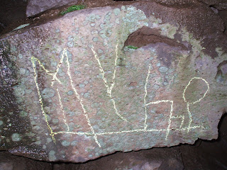 La scritta è realizzata sopra i licheni, eh si, il lichene non l'ha ricoperta, per cui, se tanto mi dà tanto. non si tratta di una scritta antica.